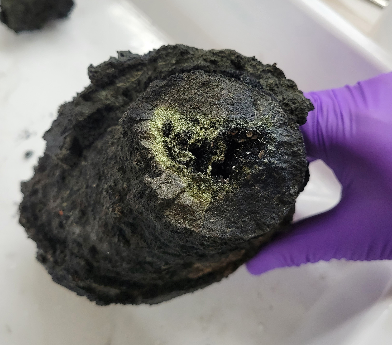 Dives at these locations resulted in the collection of plume water, handfuls of Rimicaris shrimp, and chimney samples. The chimney pieces are especially beautiful as they are made up of iron rich deposits that are black and glittery from all the pyrite that has crystallized throughout the structure, but as the chimneys are exposed to air in the lab, they start to turn dark brown as the iron oxidizes.