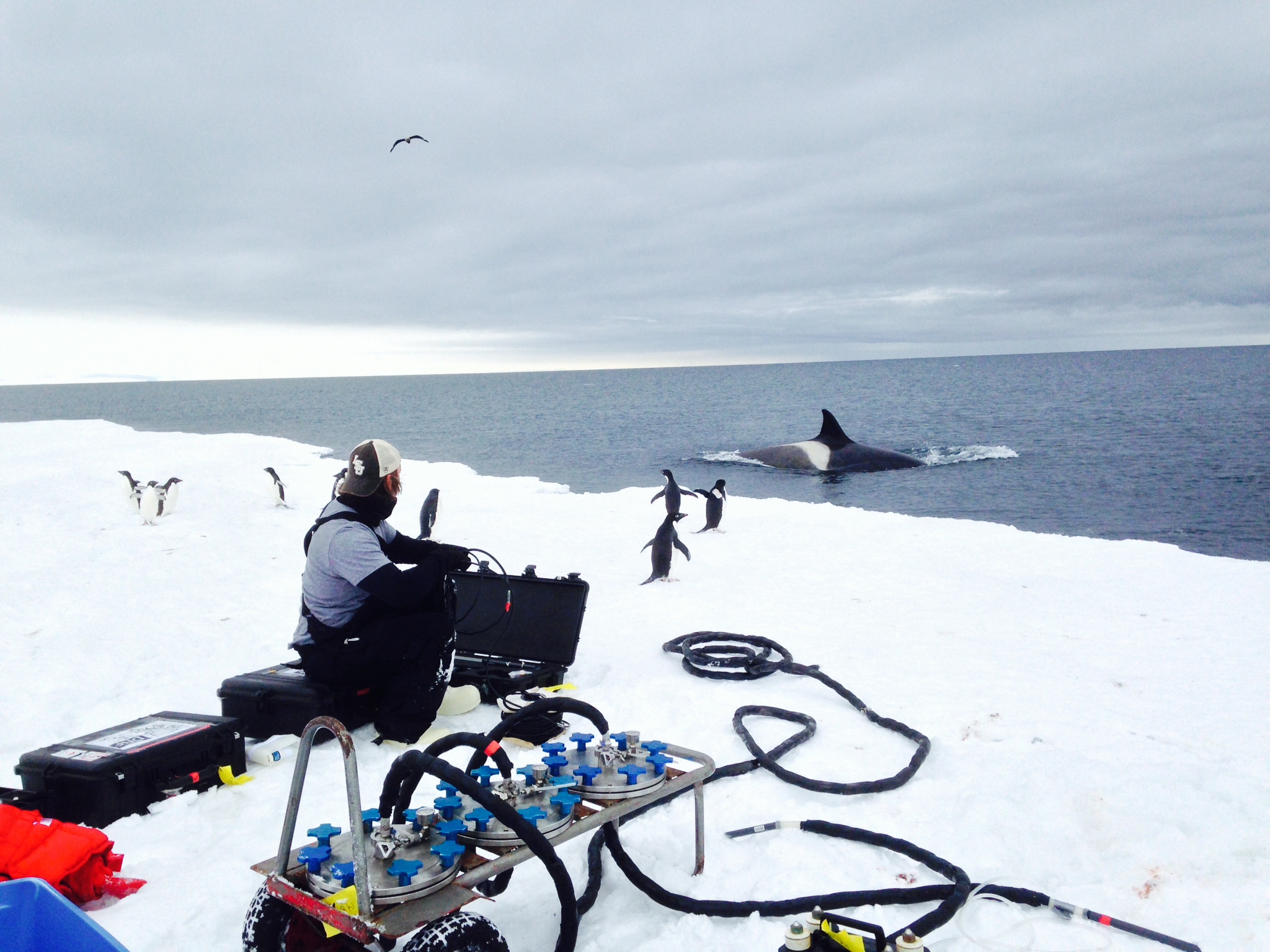 Researchers Jeffrey M. Hoffman and Andrew E. Allen from the J. Craig Venter Institute and Scripps Institution of Oceanography, and Jena Spackeen from the Virginia Institute of Marine Science sampling the sea ice edge for microbial plankton in McMurdo Sound, Antarctica (2015). Photo Credit: Erin M. Bertrand.
